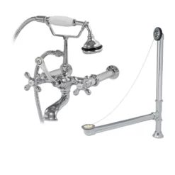 This wall-mounted tub faucet set is the perfect addition to your freestanding or clawfoot bathtub. Each faucet set includes a bathroom wall-mounted British telephone tub faucet, and an extended chain and stopper tub drain. Metal cross handles with porcelain inlays add to the beauty of the faucet.