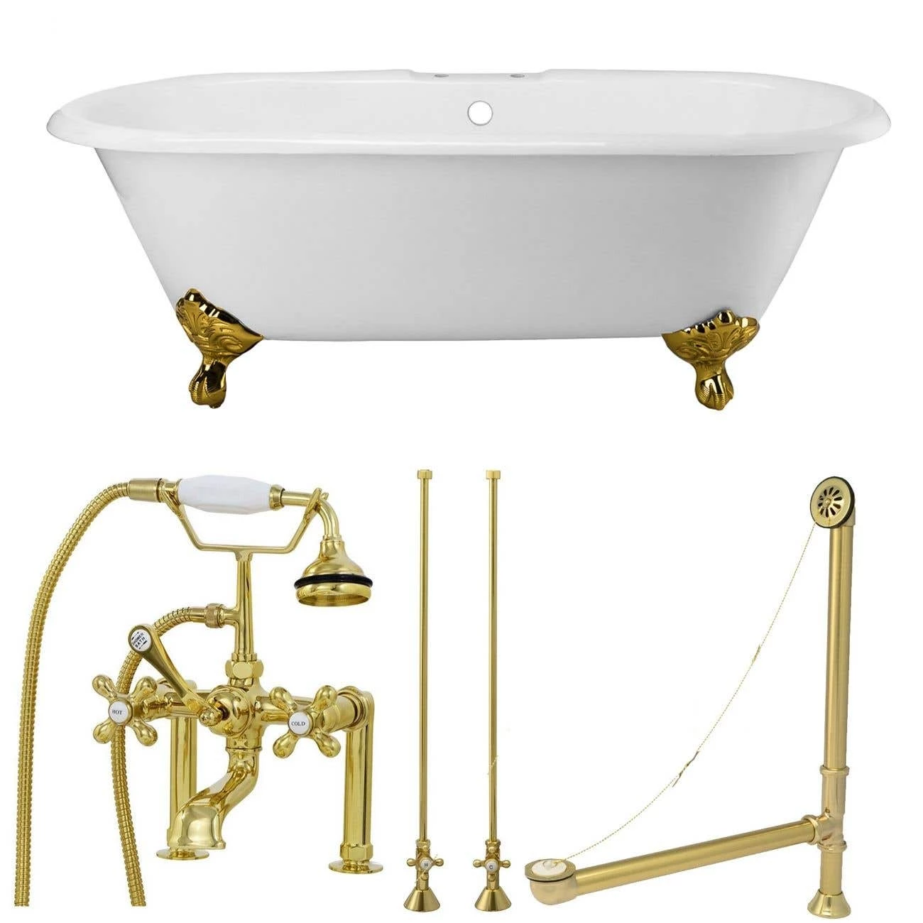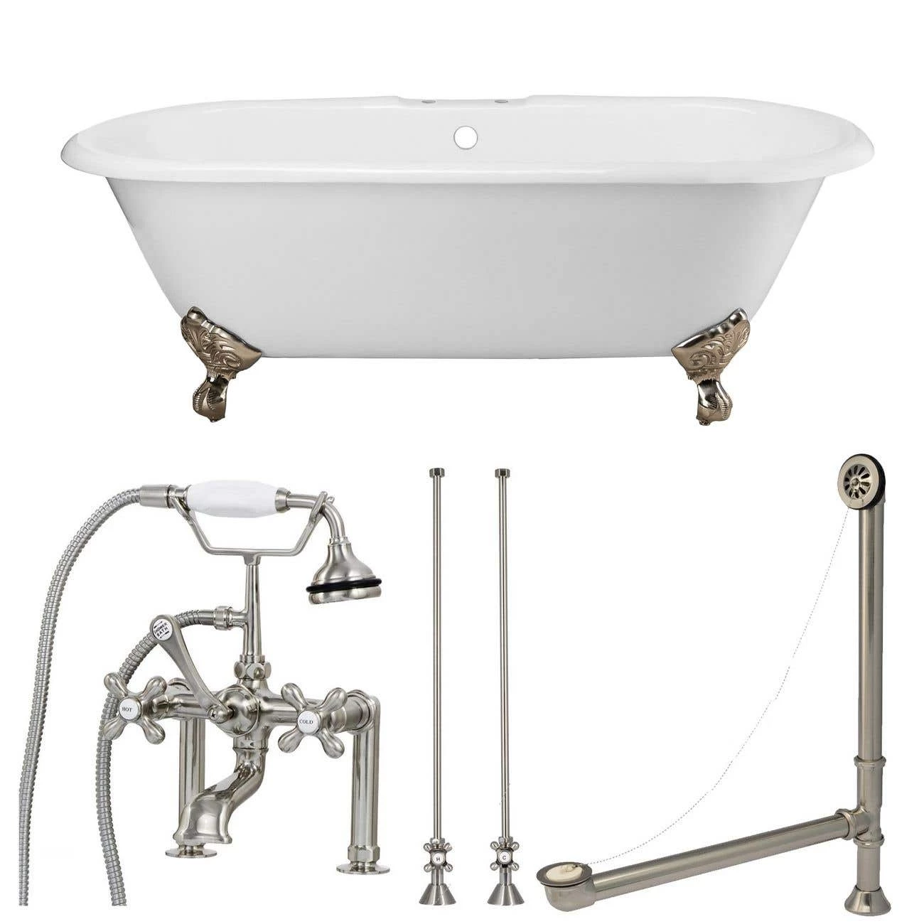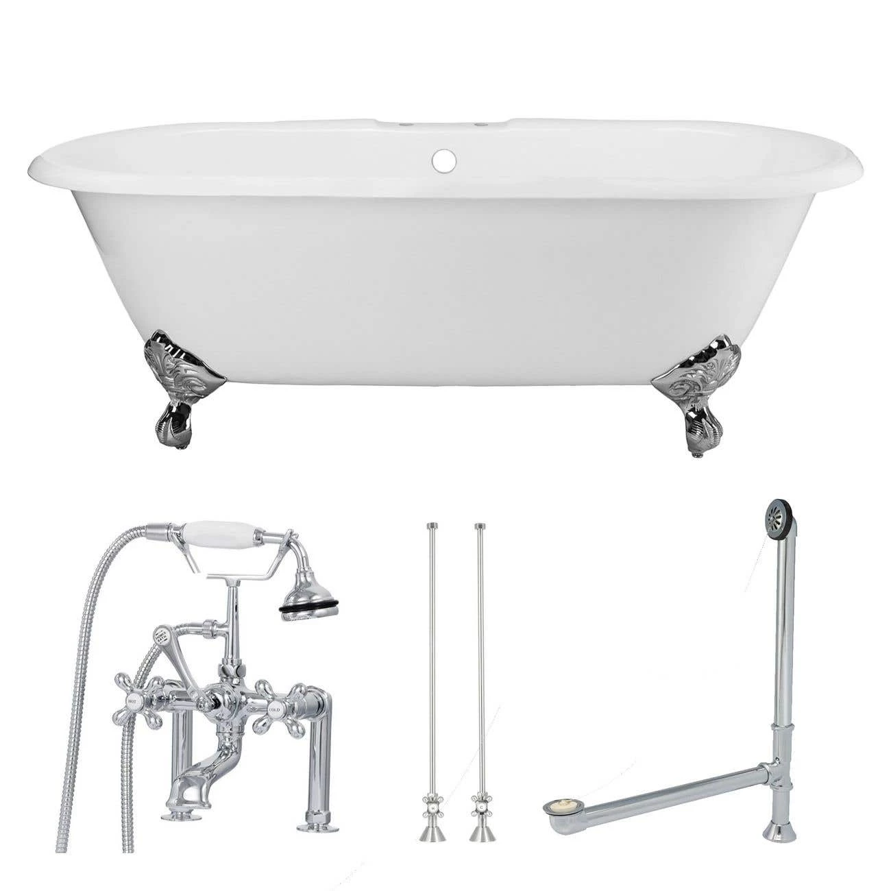 - Package includes: 60 or 66 inch Cast Iron Double Ended Clawfoot Tub, Tub Rim Mount British Telephone Clawfoot Tub Faucet with Handshower, Chain & Stopper Drain, and Clawfoot Tub Straight Supply Lines with Shut Off Valves.