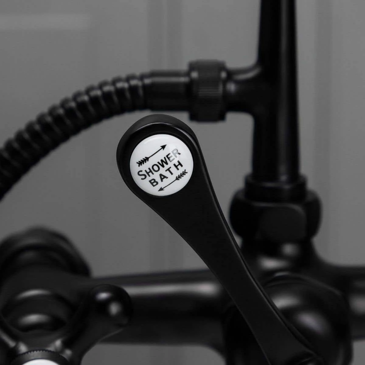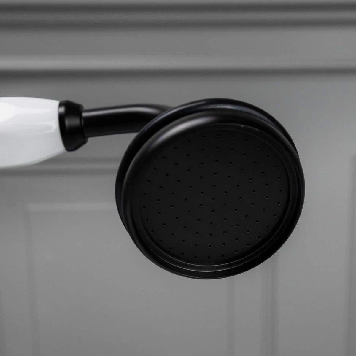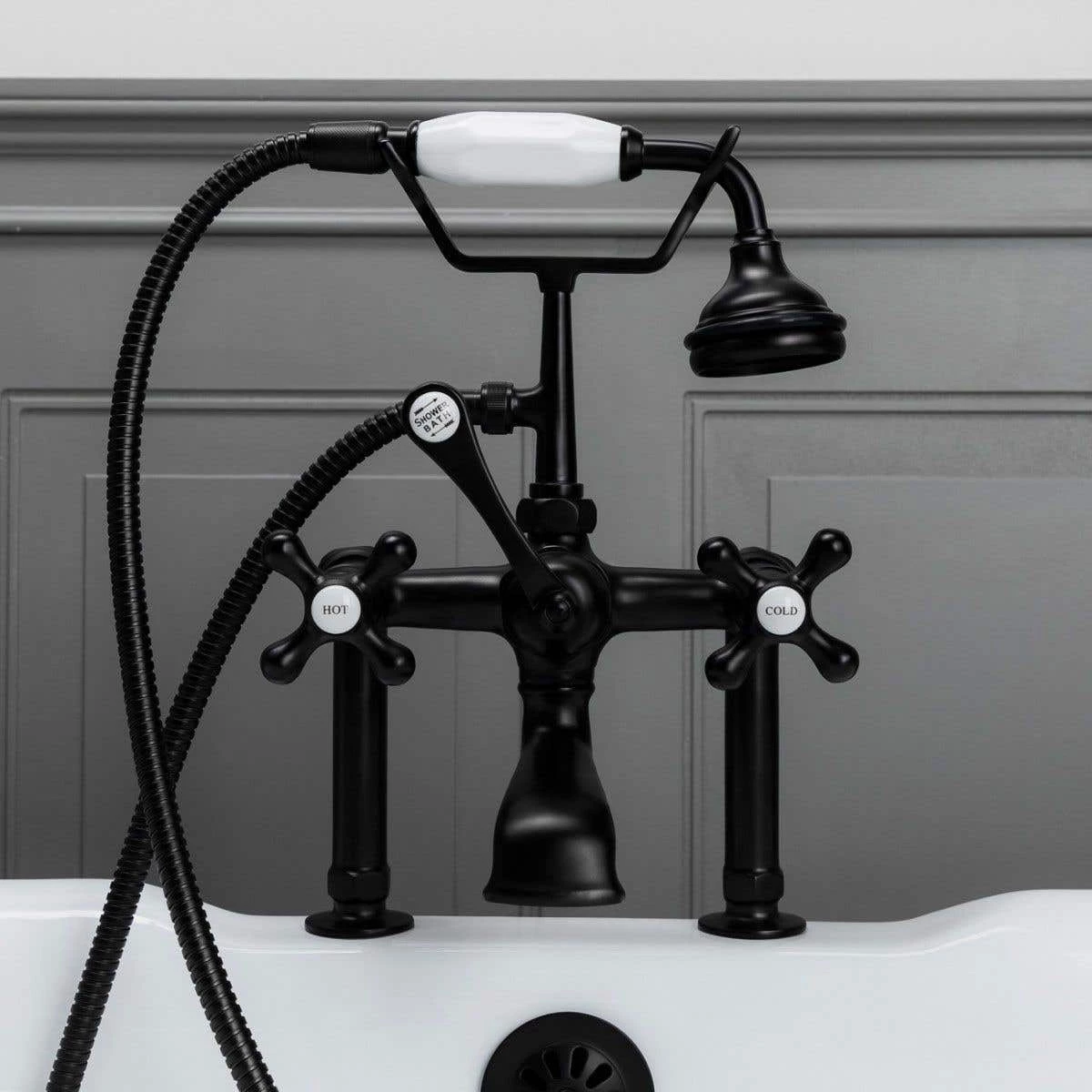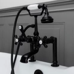 Beautiful in its style, the rim mount faucet boasts solid brass construction with porcelain inserts on the water and shower handles. The telephone faucet with handshower provides every luxury needed in your bathroom suite.