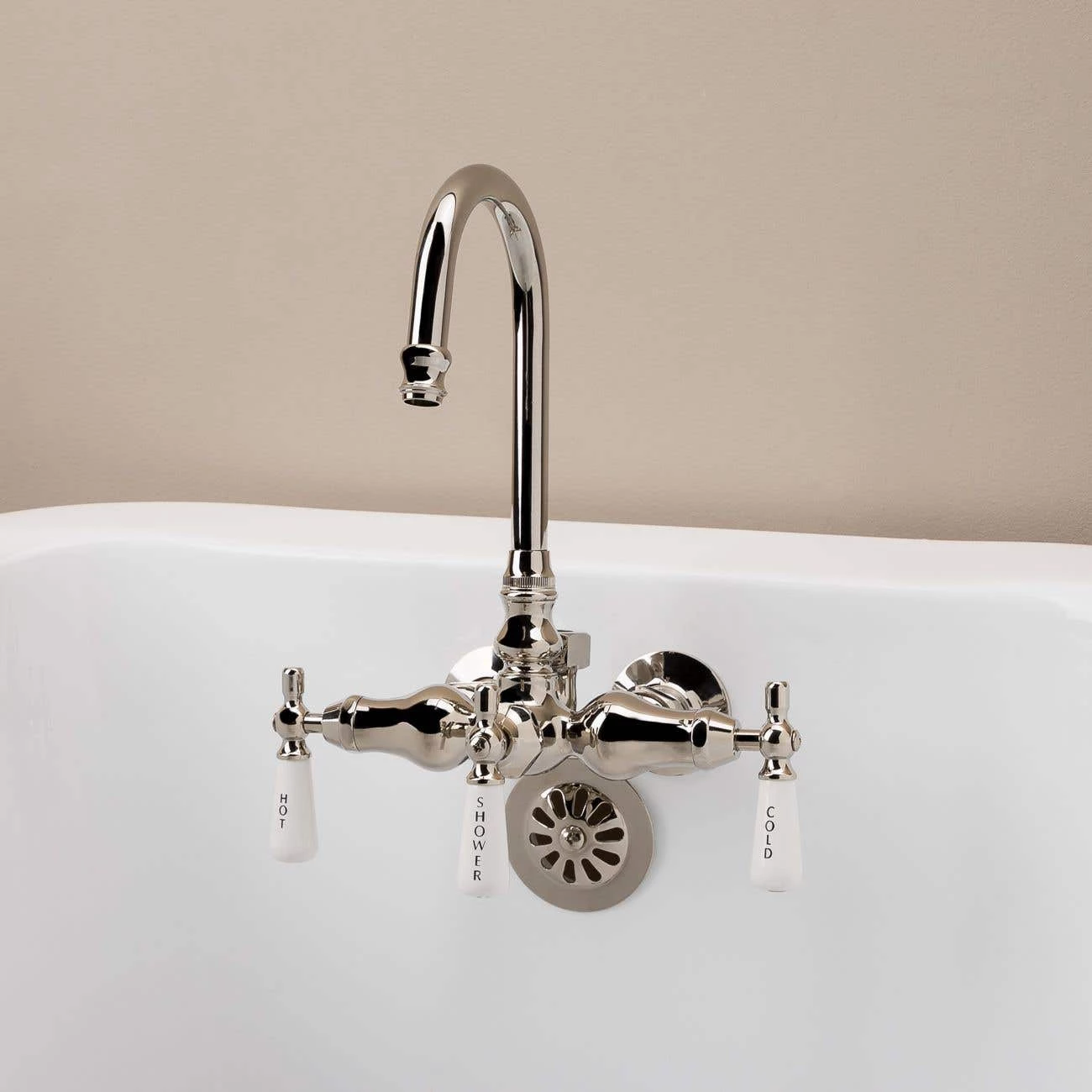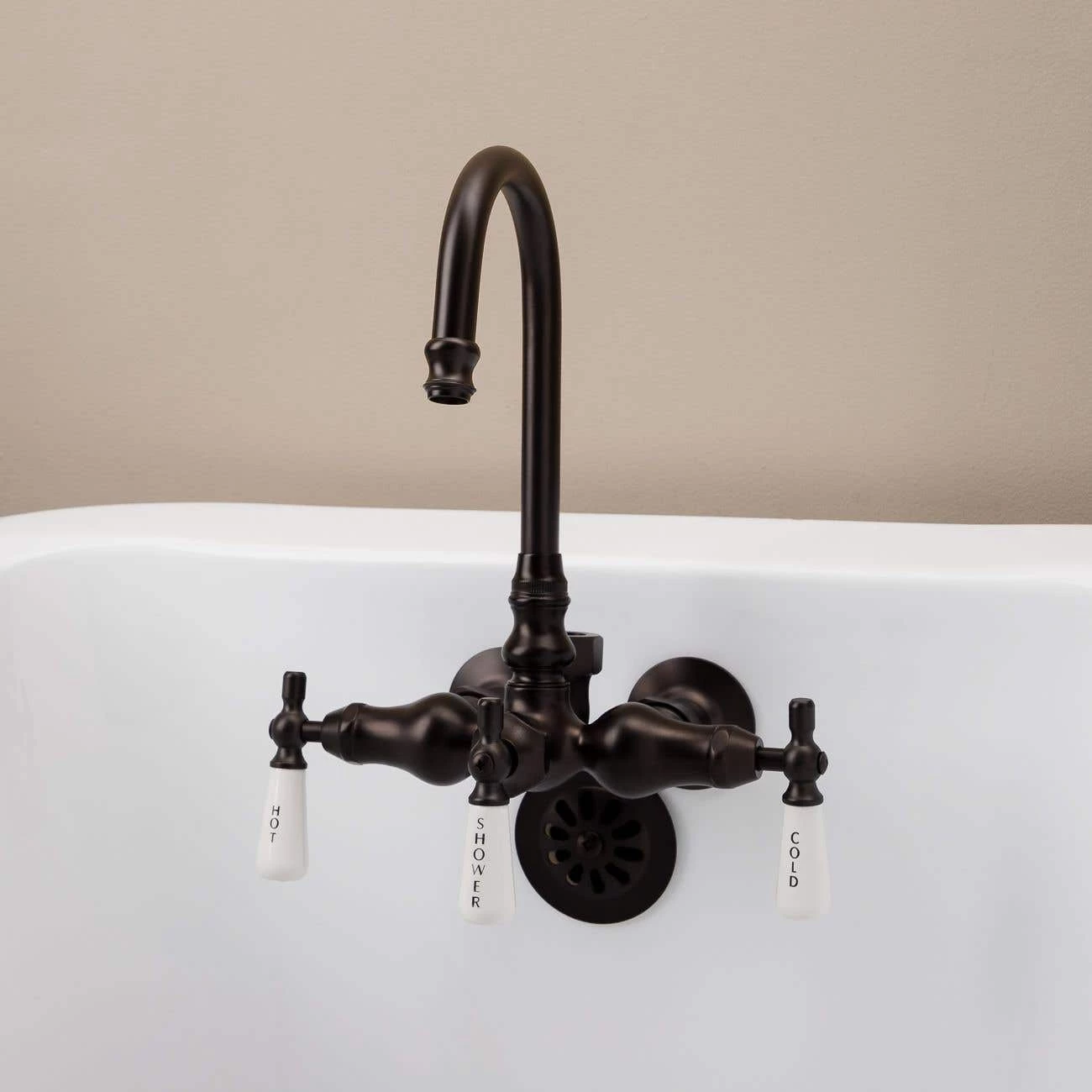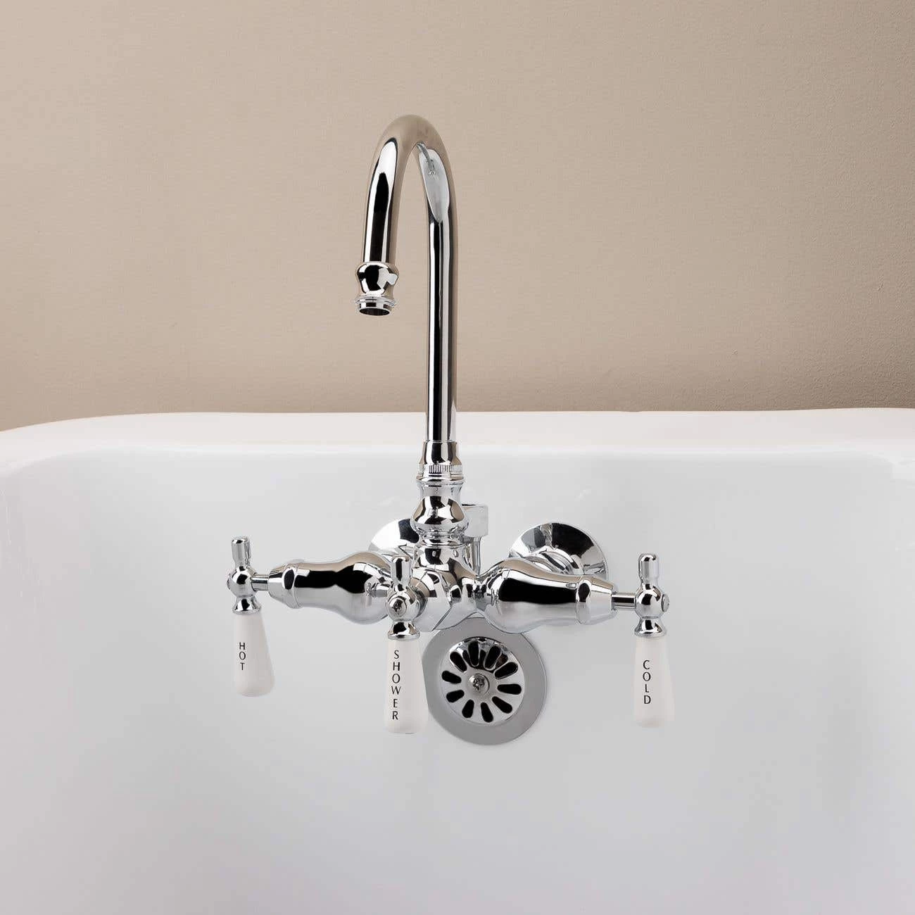 The elegant and simple design of this wall mount gooseneck faucet with a classic three ball design will fit perfectly with your bathroom decor. Lettered porcelain lever handles add a classic element, while the solid brass construction is designed with durability in mind.