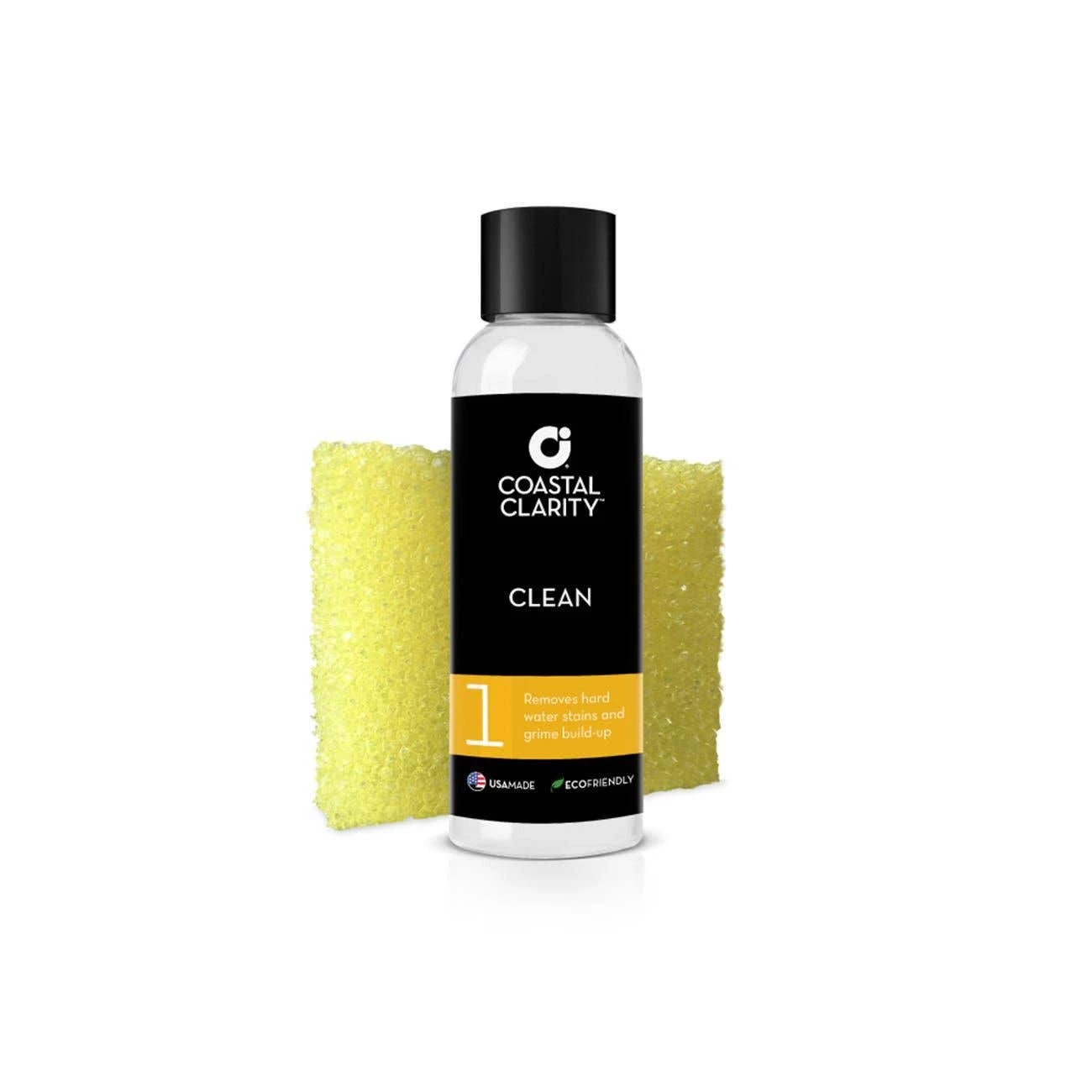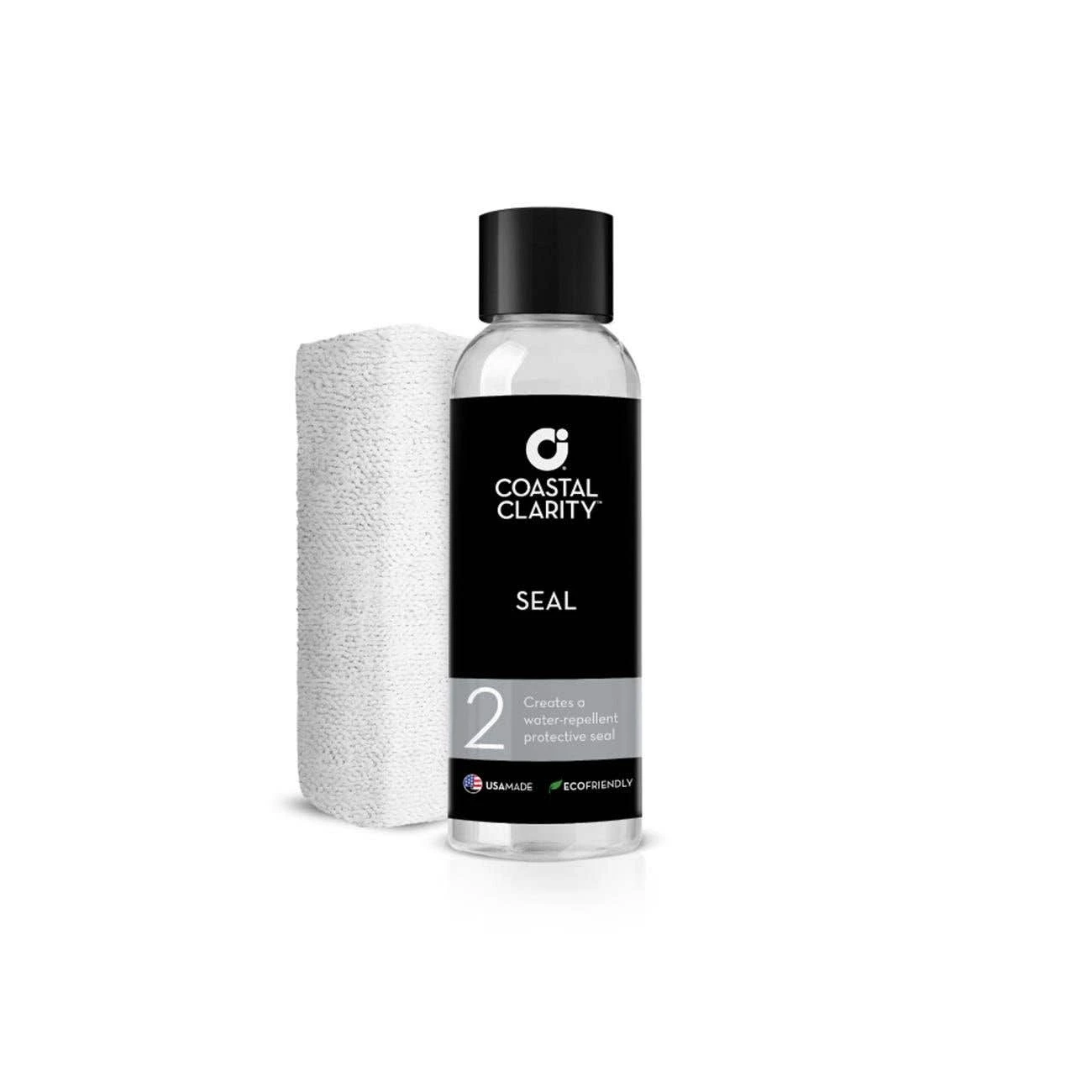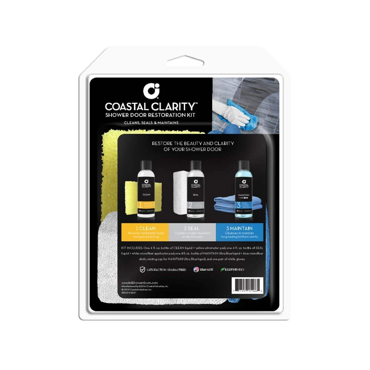 - This complete shower glass restoration, protection and maintenance kit includes: One 4 fl oz bottle of Coastal Clarity Clean cream, One 4 fl oz bottle of Coastal Clarity Seal liquid, One 4 fl oz bottle of Coastal Clarity Maintain spray liquid, One yellow Eliminator Pad, One white Microfiber Applicator Pad, One blue Microfiber Cloth, One misting cap for Preserve liquid and One pair of safety gloves