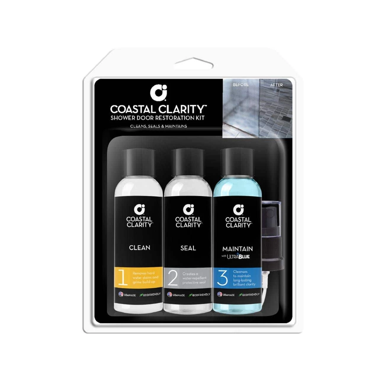 - Coastal Shower Doors exclusive three-step restoration and cleaning system for long-lasting, brilliant shower glass: Step One: Clean Renew your shower door and buff away impurities with our eco-friendly and non-abrasive Coastal Clarity Clean Cream and the Eliminator Pad. Manufactured specifically to remove hard-water stains and soap scum that have built up over time, Clean Cream also removes oxidation on glass shower enclosures. Step Two: Seal Protect your shower door and create a streak-free finish with Coastal Clarity Seal treatment and the microfiber applicator pad. In this step, a unique co-polymer formulation restores shower doors to their factory finish by filling microscopic pores, scratches and etchings, while providing a durable, long-lasting protective coating. This wipe-on treatment is water-repellent, maintaining the brilliance of shower glass and helping prevent oxidation, corrosion and growth of pathogens for up to 18 months. Step Three: Maintain Maintain your enclosure’s excellent clarity with Coastal Clarity Maintain treatment and the blue microfiber cloth. This residue-free cleaner is perfect for general maintenance and care. Coastal Clarity Maintain reduces surface tensions and penetrates grime, keeping shower glass clean so surfaces stay cleaner up to