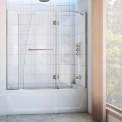 The DreamLine Aqua is frameless shower or tub screen with European appeal and modern architectural design. With a stunning curved silhouette that creates an open, inviting feel, the Aqua will transform your bathroom with elegant style to match its functionality. The Extender Panel provides additional splash coverage. Turn the style in your bathroom space up a notch with the Aqua Tub Door with Extender Panel.