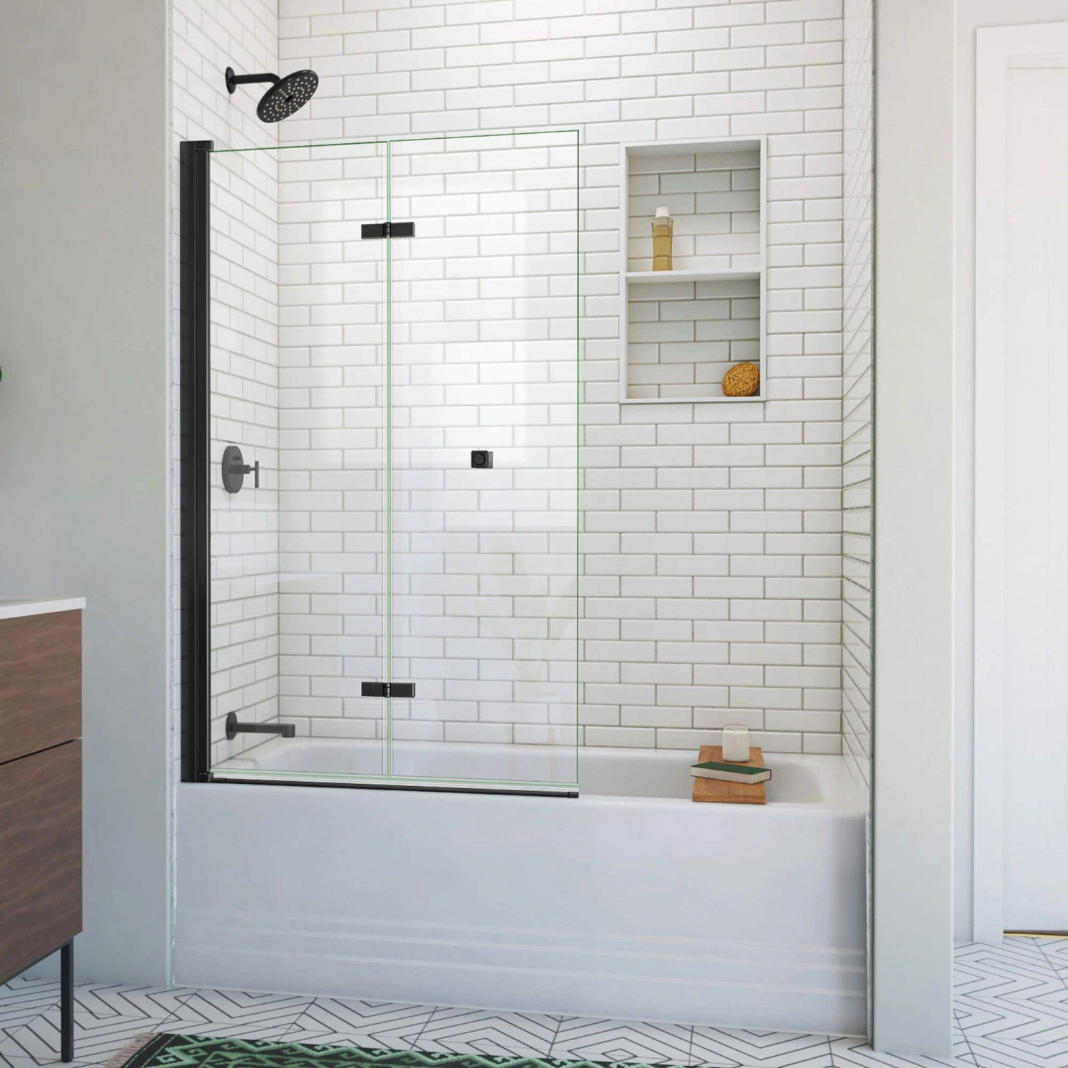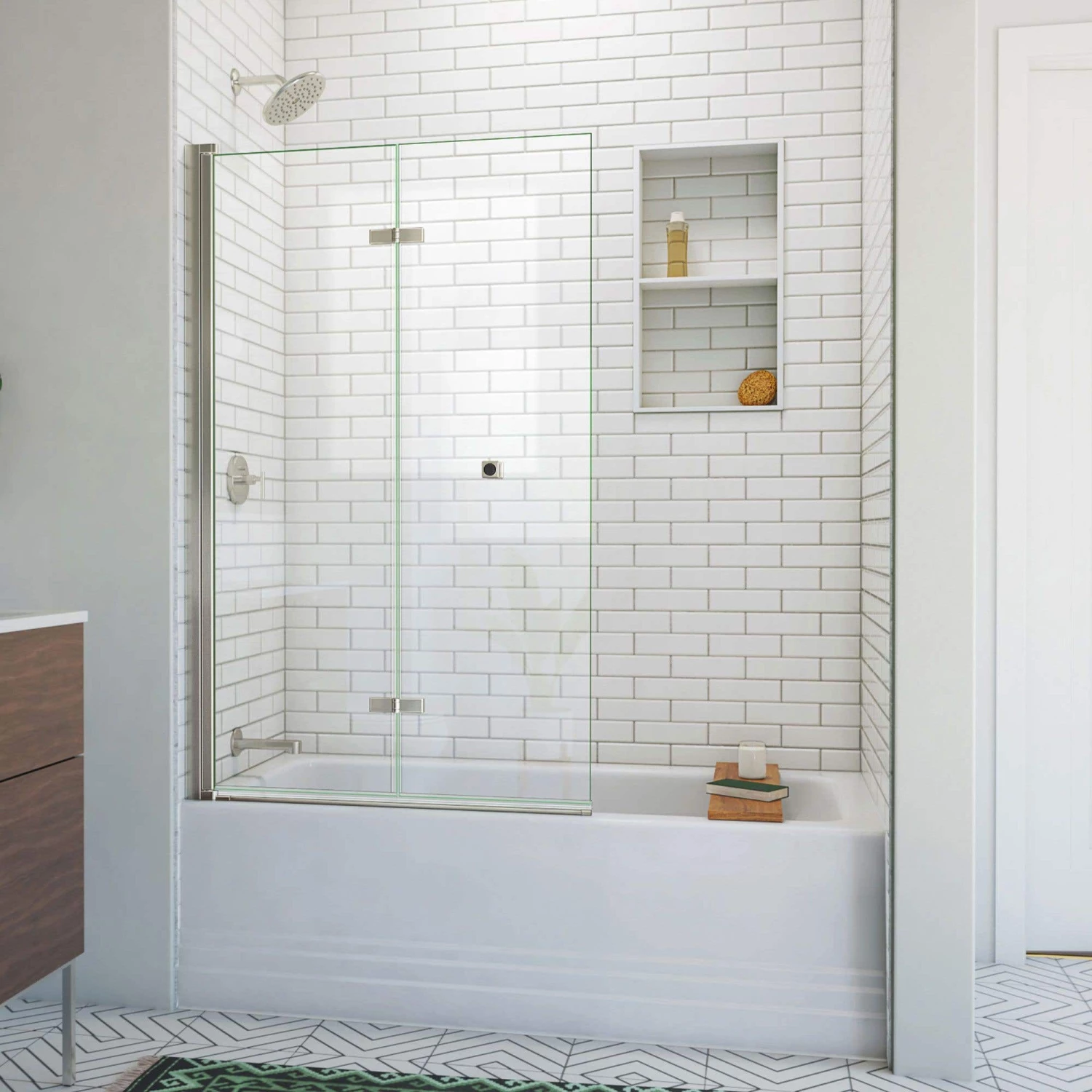 The DreamLine Aqua-Q Fold is a bifold tub screen with an inviting design. The Aqua-Q Fold features a continuous, self-centering pivot that allows rotation in and out of the shower. Transform your bathroom with ease and convenient functionality of maximized walk-in space.
