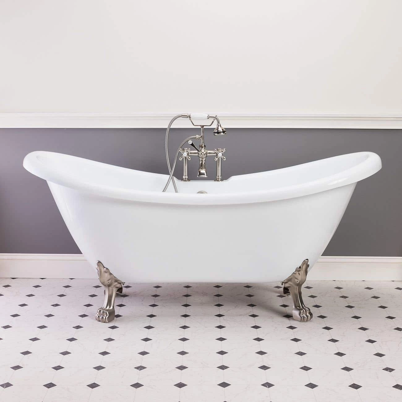 The height in elegance, the Florence Double Slipper Clawfoot Tub will transform your bathroom into a spa-like getaway. Inspired by vintage designs, this clawfoot tub is elevated on handsome lion paw feet. The double slipper design allows for comfortable reclining at either end, allowing you to fully stretch out.
