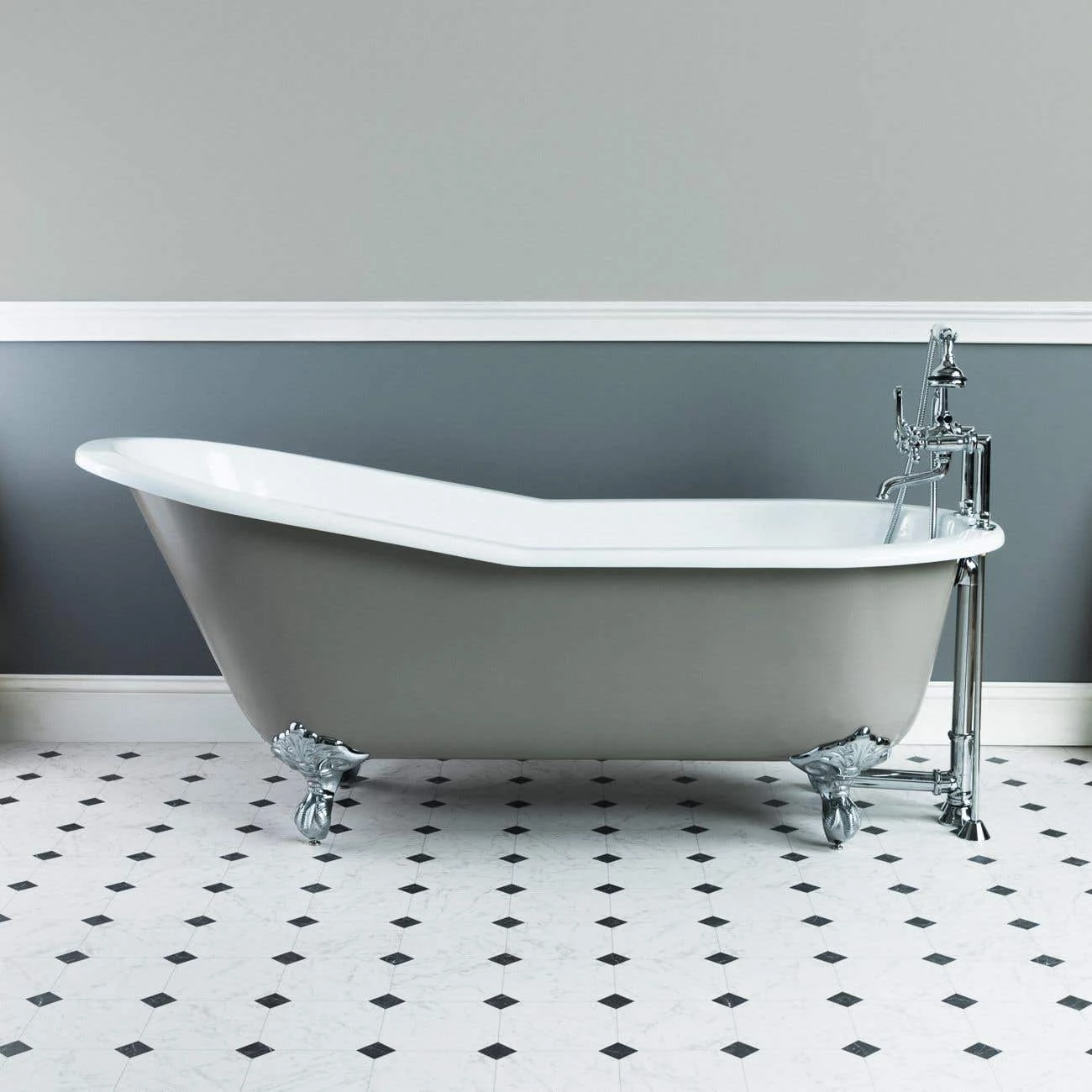 Recline and enjoy the luxury of the Mila Slipper Clawfoot Tub. Painted a beautiful light taupe, this clawfoot tub is the perfect addition to your master bathroom. Cast iron construction ensures this tub is built to last. The high slipper back provides maximum comfort, while the tub rests upon intricately detailed imperial ball and claw feet.
