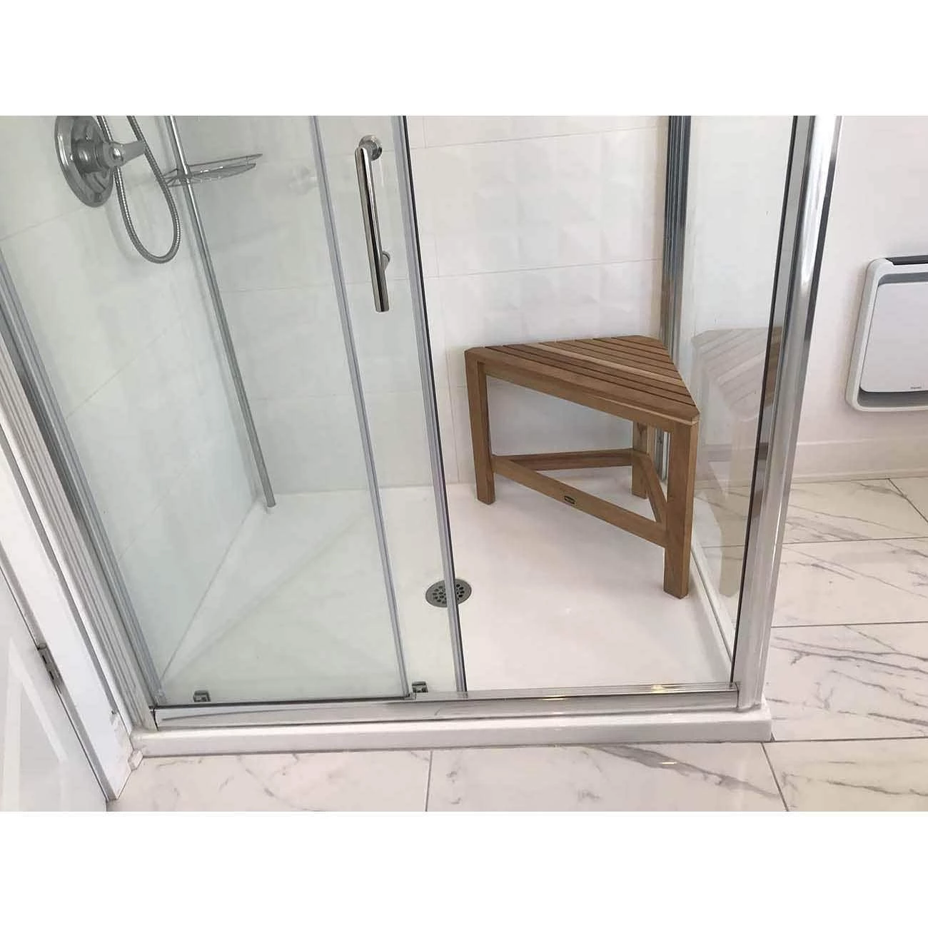 Transform your shower into a relaxation haven with the RAY Corner Shower Bench by Gala Teak. It conveniently fits into the corner of your shower, providing a generous seating area while requiring only the minimum required space. Beautiful, functional and always warm in look and feel, have a seat under the warm water and focus on you! We know sustainability is important to you: the RAY Shower Bench is made from eco-friendly, certified Indonesian plantation teak. No other wood stands up to water humidity and the test of time like teak.