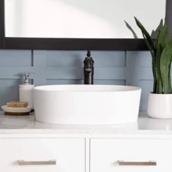 The Solano Vessel Sink offers a sleek design to keep your vanity clean. This rectangular sink has gently curved edges and clean lines. A beautiful addition to any bathroom, the Mindy Sink has a timeless look that will complement any bathroom decor.