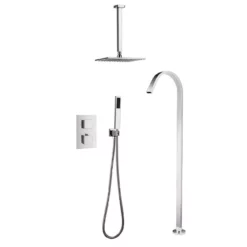 - Set includes: freestanding tub faucet, ceiling mounted shower arm & rainfall showerhead, wall mount handheld shower, and in-wall diverter